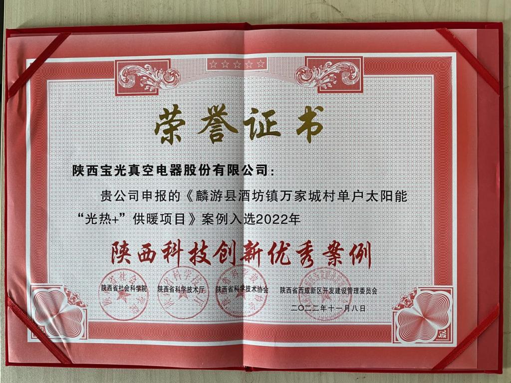 近日,陜西省社會(huì)科學(xué)院、陜西省科學(xué)技術(shù)廳、陜西省科學(xué)技術(shù)協(xié)會(huì)、陜西省西咸新區(qū)開發(fā)建設(shè)管理委員會(huì)聯(lián)合發(fā)布“2022年陜西科技創(chuàng)新優(yōu)秀案例”,寶光股份申報(bào)的《麟游縣酒坊鎮(zhèn)萬家城村單戶太陽能“光熱+”供暖項(xiàng)目》成功獲選高效治理高品質(zhì)生活組“陜西科技創(chuàng)新優(yōu)秀案例”。