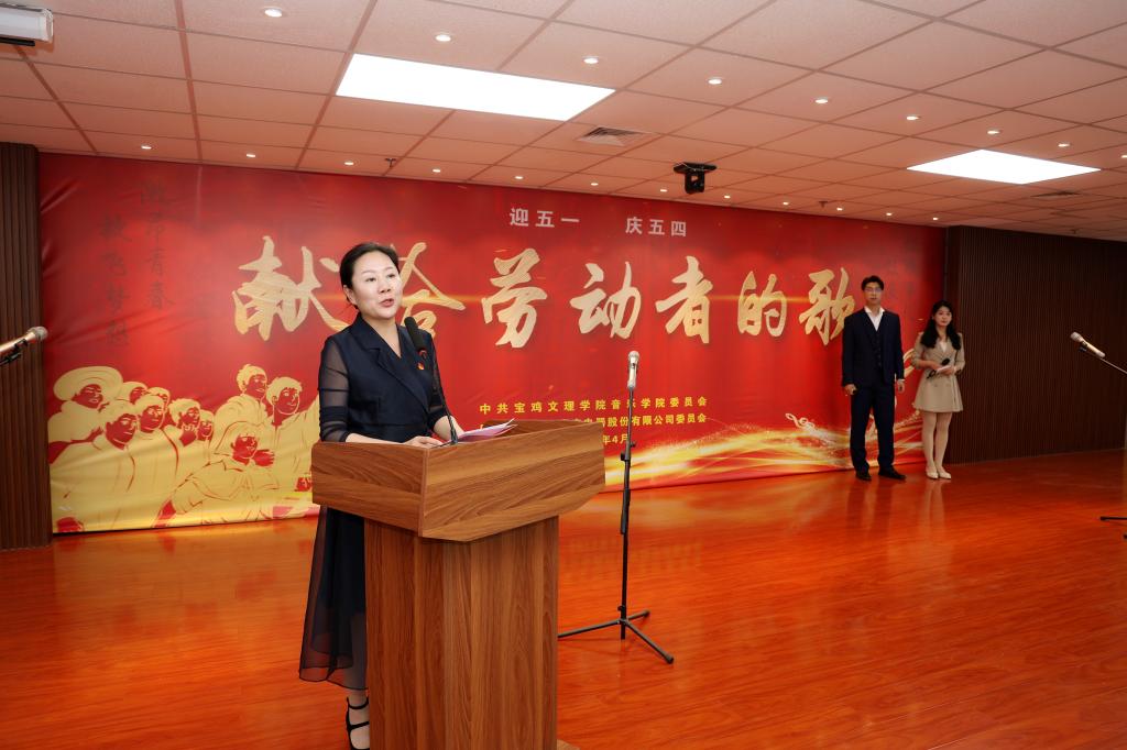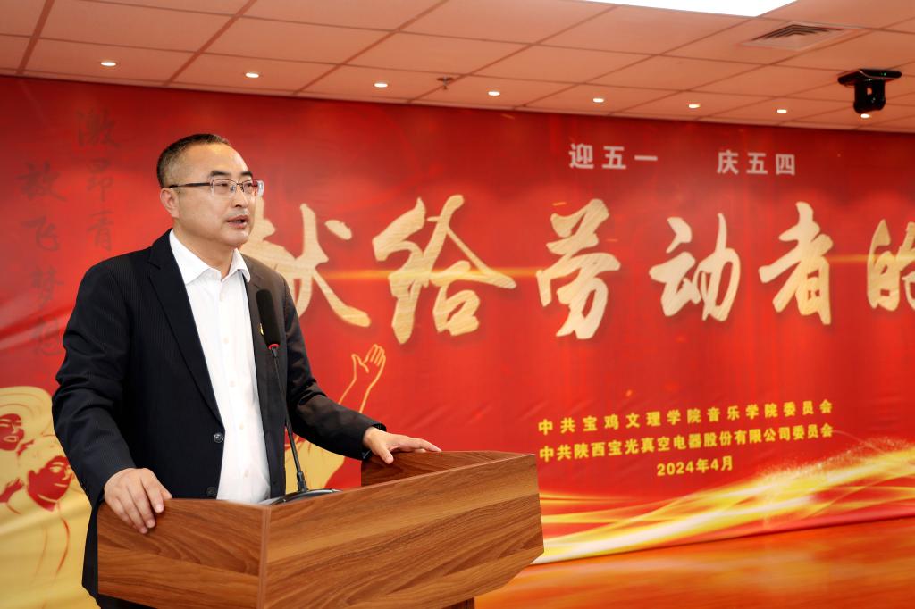 為深入學(xué)習(xí)宣傳貫徹習(xí)近平新時代中國特色社會主義思想和黨的二十大精神,切實營造尊重勞動、關(guān)愛青年的濃厚氛圍,在“五一”勞動節(jié)、“五四”青年節(jié)來臨之際,公司黨委與寶雞文理學(xué)院音樂學(xué)院黨委聯(lián)合開展“弘揚勞動精神 傳承工匠文化”道德講堂,為廣大干部職工送上了一場精彩紛呈的文化大餐。寶雞文理學(xué)院音樂學(xué)院黨委書記黃瑋、寶光股份黨委書記、董事長謝洪濤出席活動并致詞。